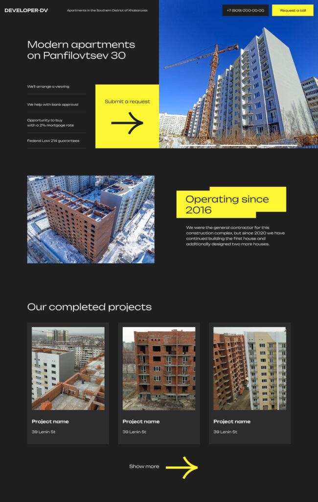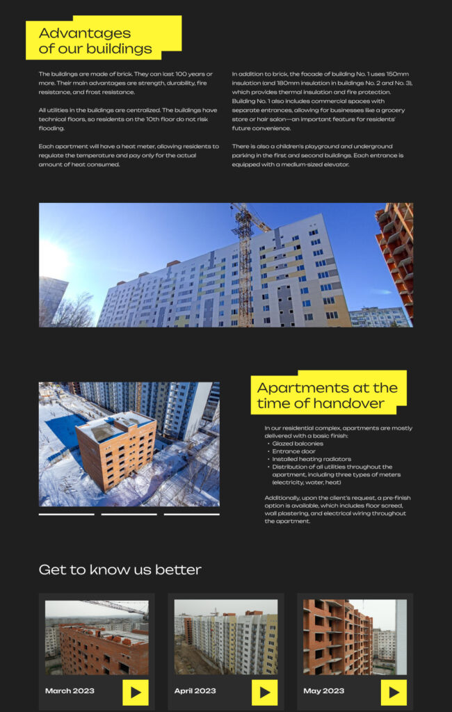 We conducted a marketing study and developed a custom-designed landing page on Tilda that enhanced the developer’s reputation by highlighting the company’s key advantages.
