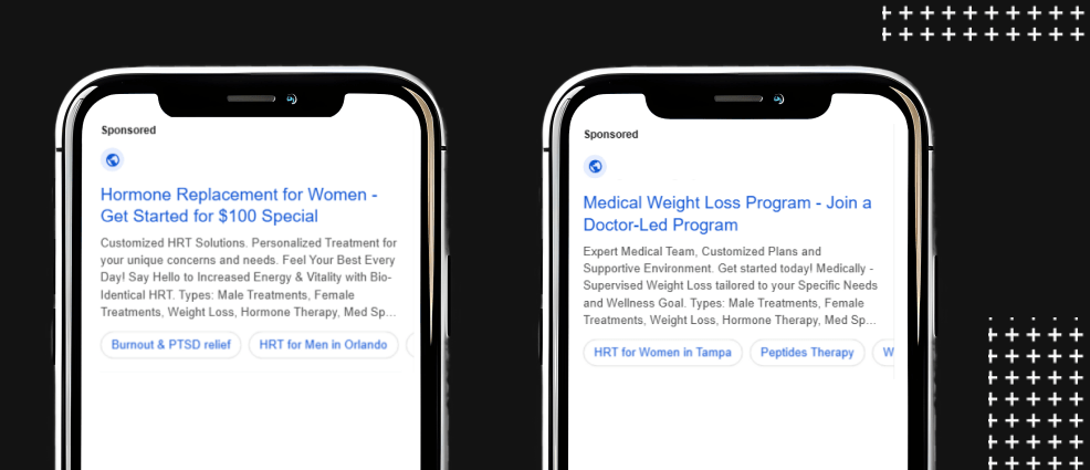 To meet Google’s medical advertising requirements, we rewrote ad copy, removed restricted terminology, and built dedicated landing pages for TRT, HRT, and weight loss. This ensured stable approvals and higher conversion rates.